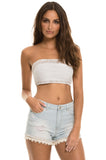 This soft lacy bandeau embraces your body with its easy styling. The flexible side seam stays to hold it in place and no straps! It's in the lined front where you need it, and not in the back where you don't. Wear it under your favorite top or alone. Made of super-soft polyester and spandex to hold it in place.