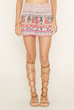 Patrons of Peace Patchwork shorts. Features an allover floral patchwork print. Elasticized smock waistband with contrast pink stitching. Crochet trim detailing at the leg openings. Hand pockets at the side seams. Inseam: 4". 100% rayon. Hand wash. Imported.