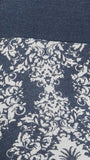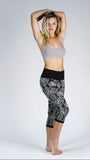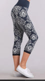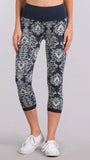Sophisticated pattern meets athletic performance. These cropped leggings elevate your workout wardrobe with an intricate damask jacquard design in navy and white tones. The all-over pattern creates visual interest while maintaining a timeless, elegant appeal.