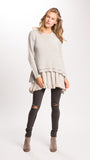 This heather gray sweater features high rounded neckline and long sleeves, with frill detail at the the hi-lo hemline. Scalloped edge finished with a relaxed fit through the body.