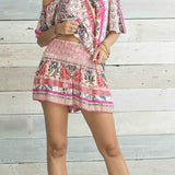 Woven printed top in crepe fabric. Scoop neckline, with elbow cold shoulder sleeves. Pullover construction.Hand washable 100% rayon. Imported.