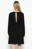 Lovely ivory crochet lace overlay top dress, rounded neckline, darted bodice. Sheer, long sleeves sit atop a full swing skirt. Long sleeves with button cuffs, keyhole cutout back.
