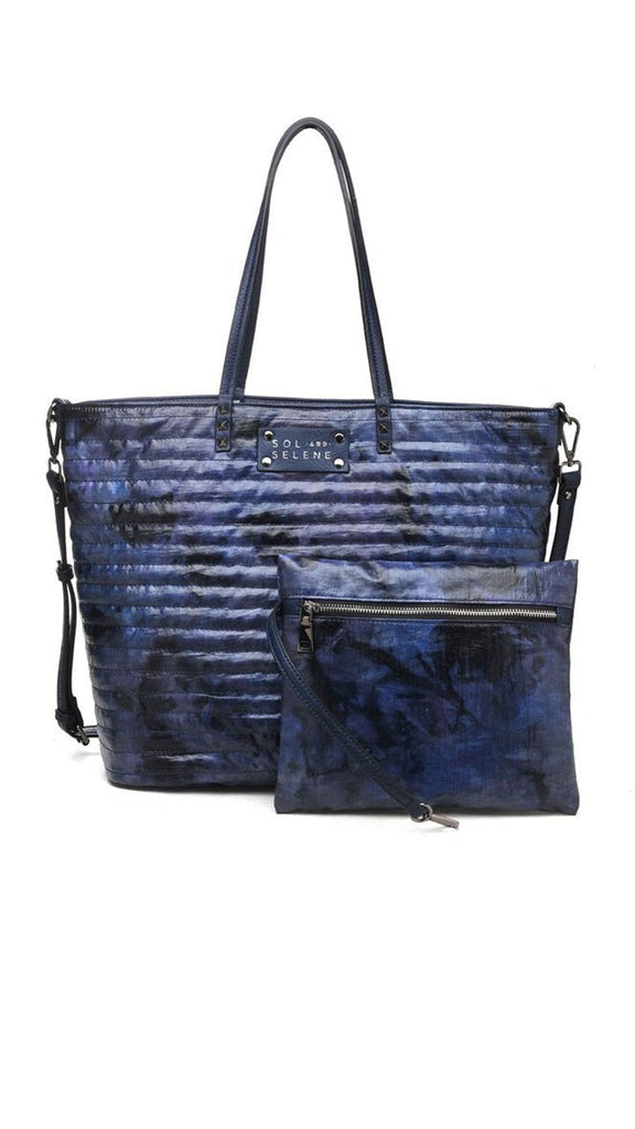 Effortlessly cool, this quilted reversible nylon tote features a large inside compartment to safely store all of your recent purchases and beyond. In a fresh and modern grey marble print, it also boasts a detachable matching pouch inside for access to quick items on-the-go, a stylish studded handle, as well as an adjustable shoulder strap. 100% Nylon with solid color trim. 19” x 12.5” x 6.5”.