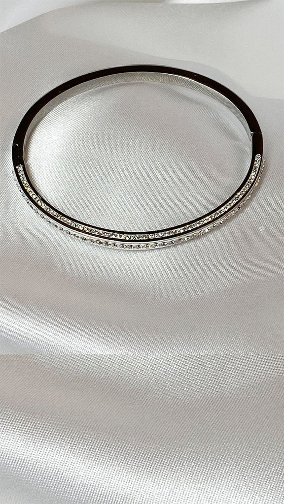 The definition of chic dazzle features a stunning Pavé bangle that's decorated all over in sparkling Cubic Zirconia. This stackable bangle is illuminated by a single row of pave set brilliant stones on the front, top, and bottom