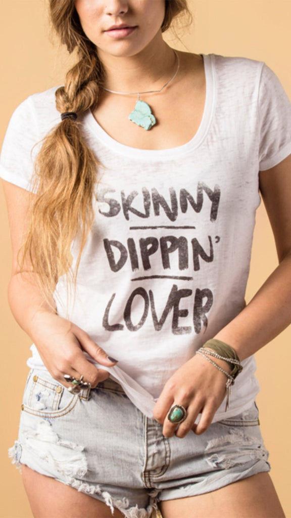 Our "Skinny Dippin' " graphic tee is made in the USA.
