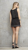 Patrons of Peace black & white button front romper. Features an allover geometric print with draw. . Slanted hand pockets Tonal lining. inseam: 2.25". 100% rayon. Hand wash. Imported.