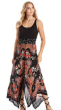 Fun, flowy, fantastic hemline! Great summer skirt with an all-over bandana pattern. Wide stretch waistband will be very comfortable for a night out on the town. Black background and beautiful boho style print.