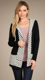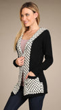 Get twice the mileage from this hoodie jacket. Perfect for the office or those laid back days. Black and white jacquard contrast in a luxuriantly cozy wool-blend knit. Luxe comfort and style in this hooded cardigan that's open at the front and features hidden pockets.