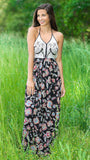 Patrons Of Peace halter maxi dress. This crinkle gauze dress features a contrasting top floral print with a four button placket. Self tie halter at the neck. Intricate bottom print with gathering at the waist. Open V-back design with an elasticized back waist for added comfort. Tonal lining for opacity. Approximate length: 55".